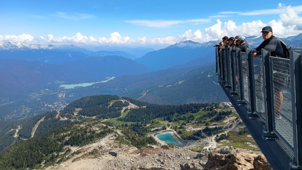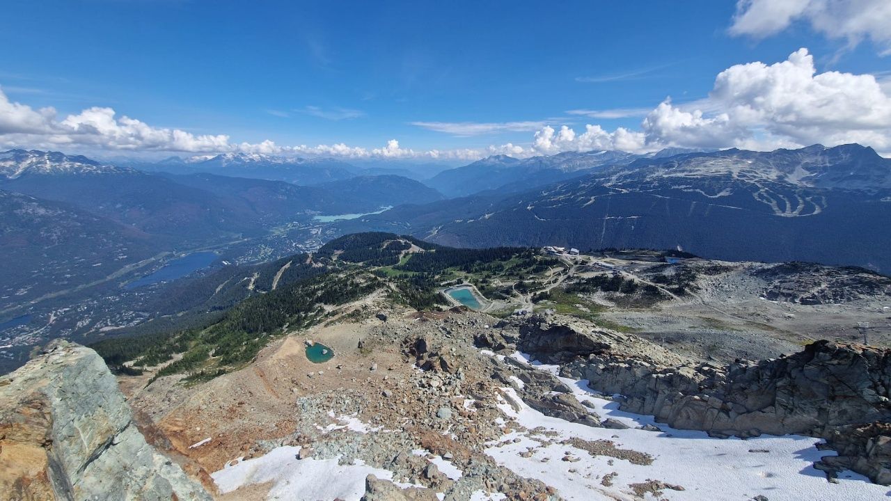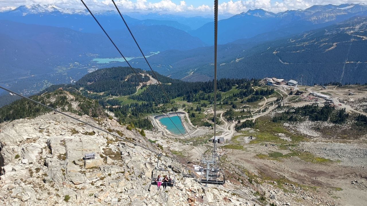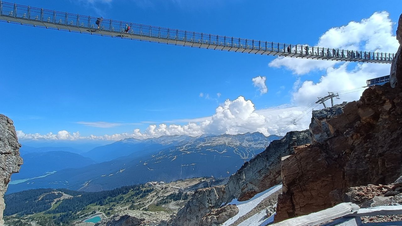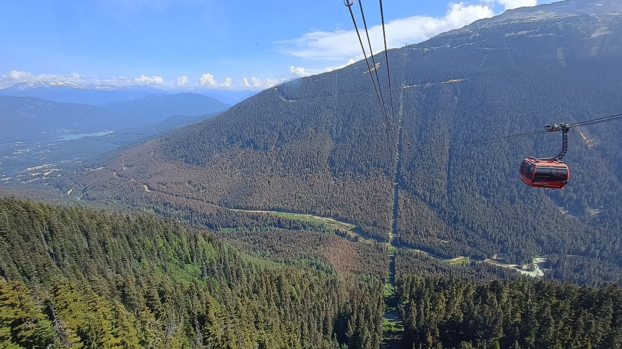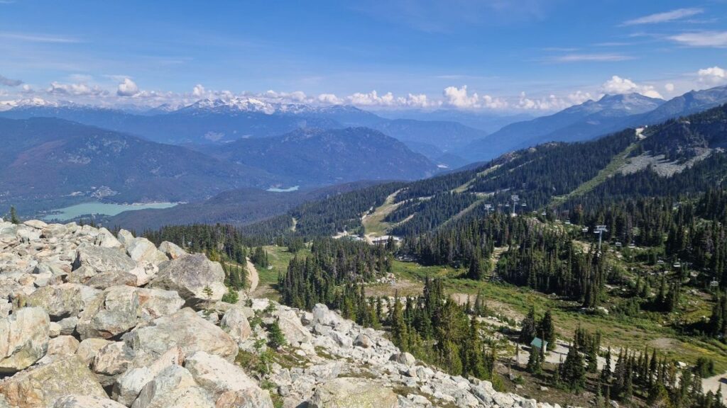 Wir fahren zuerst in die Stadt Whistler, um dort mit einer Gondel auf den Gipfel „Blackcomb“ zu fahren. Von hier oben hat man diese schöne Aussicht ins Tal.Danach fahren wir ca. 11min mit der zweitlängsten freitragenden Seilbahn der Welt (4,4km), welche die Gipfel der Berge „Blackcomb“ und „Whistler“ verbindet.Whistler war Austragungsort der Olympischen Spiele 2010 & ist eines der beliebtesten Skiresorts der WeltMit einem Sessellift, dem Peak Express geht es noch ein bisschen höher.Von hier oben ist die Aussicht noch schöner ins Tal……und es gibt auch eine schwindelerregende Hängebrücke, über die man laufen kann.Mir wurde ganz mulmig beim Blick nach unten, aber ich habe es geschafft über diese Brücke zu laufen.Auch bei 29 Grad im Sommer liegt hier oben etwas SchneeDanach geht es mit einer anderen Gondel wieder 30min ins Tal.Vier Stunden Fahrt haben wir noch vor uns. Anfangs sehen wir sehr viele Nadelbäume & blaue Seen.Später wird die Landschaft etwas karger.