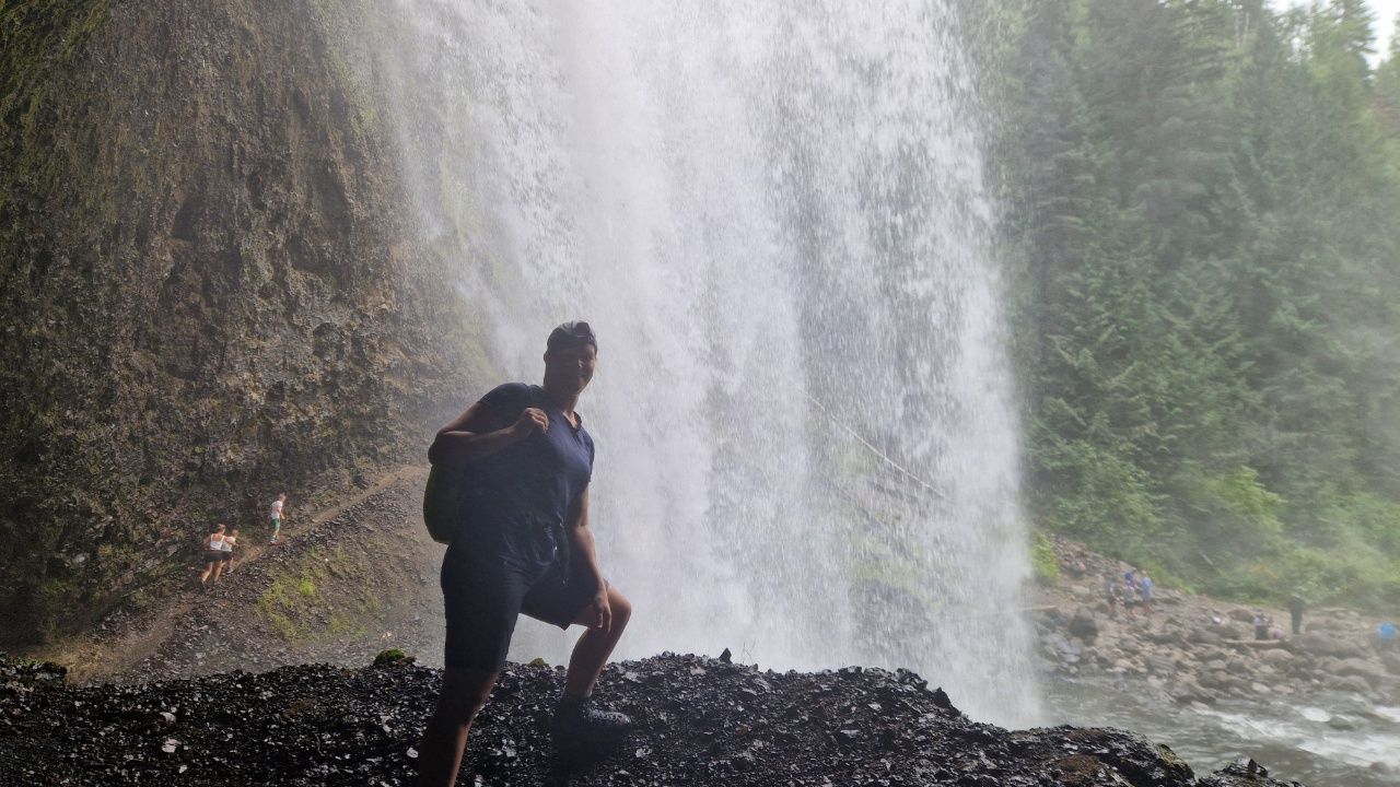 Unser erster Wasserfal heißt Spahats Creek Wasserfall. Man läuft nur 5min vom Parkplatz aus hin.Blick von der anderen Seite. Diese Schlucht ist einfach gigantisch! Rechts oben im Bild sieht man die Aussichtsplattform mit den Menschen.Der Spahats Creek Wasserfall ist 73m hoch und 8m breit.Der zweite Wasserfall, den wir uns anschauen heißt Moul Falls. Die Wanderung dauert hier vom Parkplatz aus länger, wir sind über eine Stunde unterwegs.Der Moul Falls ist zwar mit 35m nicht so hoch, aber er beeindruckt uns so sehr, weil er 9m breit ist und man darunter durchlaufen kann.Man ist danach etwas nass, aber das ist es wert.
