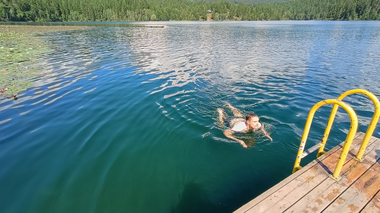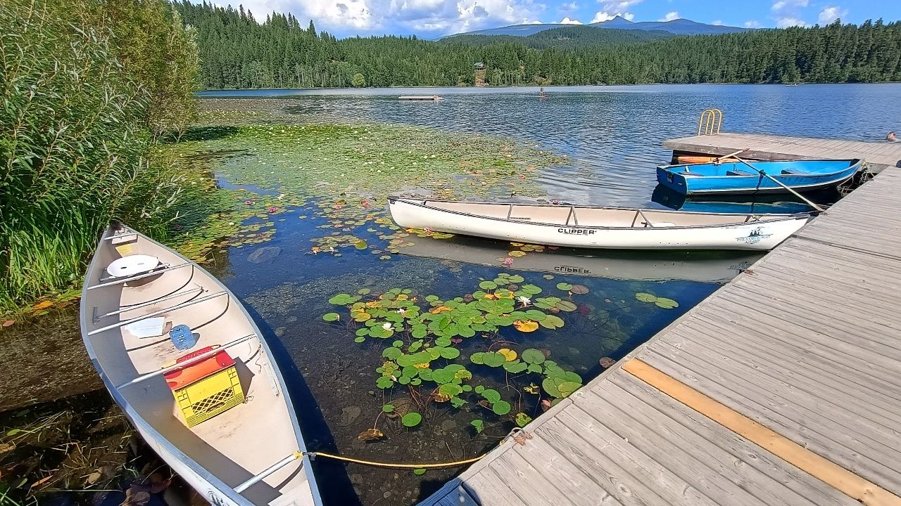 Am nächsten Tag schauen wir uns drei weitere Wasserfälle an und fahren dann ca. 40km aus dem Wells Gray Park wieder heraus in die Stadt Clearwater. Dort kaufen wir ein, tanken, waschen Wäsche und übernachten am Dutch Lake Resort. Dieser liegt an einem schönen See, in dem wir am späten Nachmittag ein bisschen schwimmen und Kanu fahren.