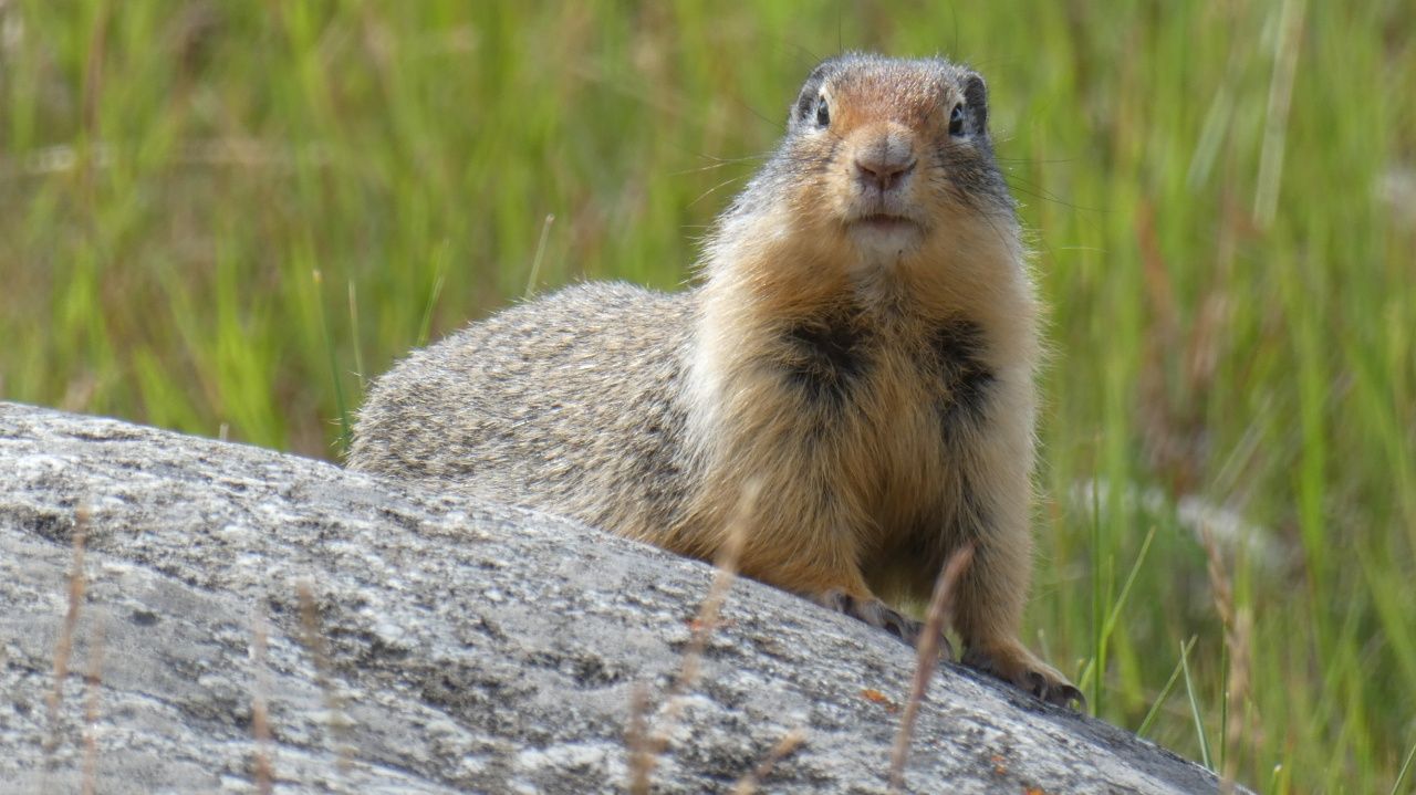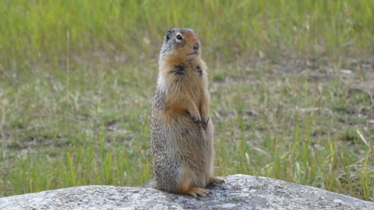 Fahrt von Clearwater nach Jasper, man sieht die Rocky Mountains am Horizont.Auf unserem Campingplatz in Jasper wohnen niedliche Erdhörnchen.Eines dieser Erdhörnchen wohnt direkt unter einem Stein neben unserem Camper.