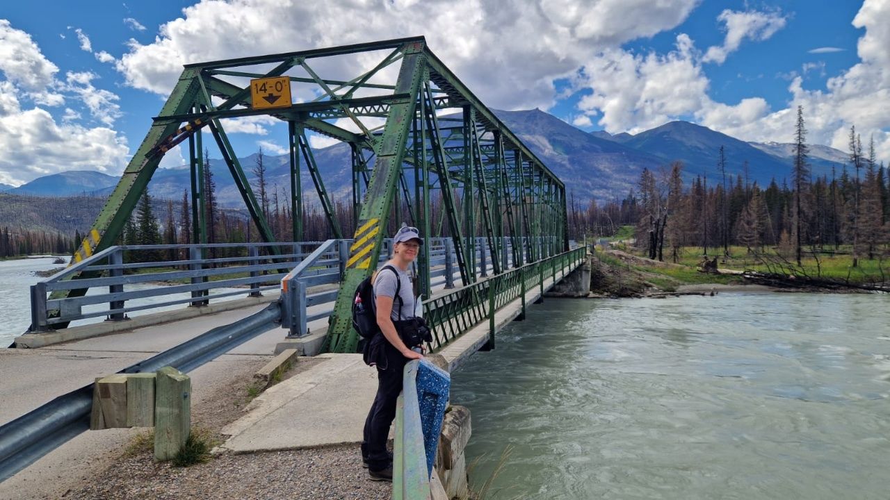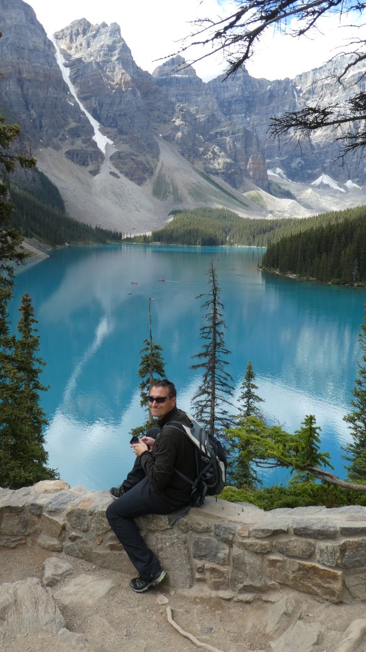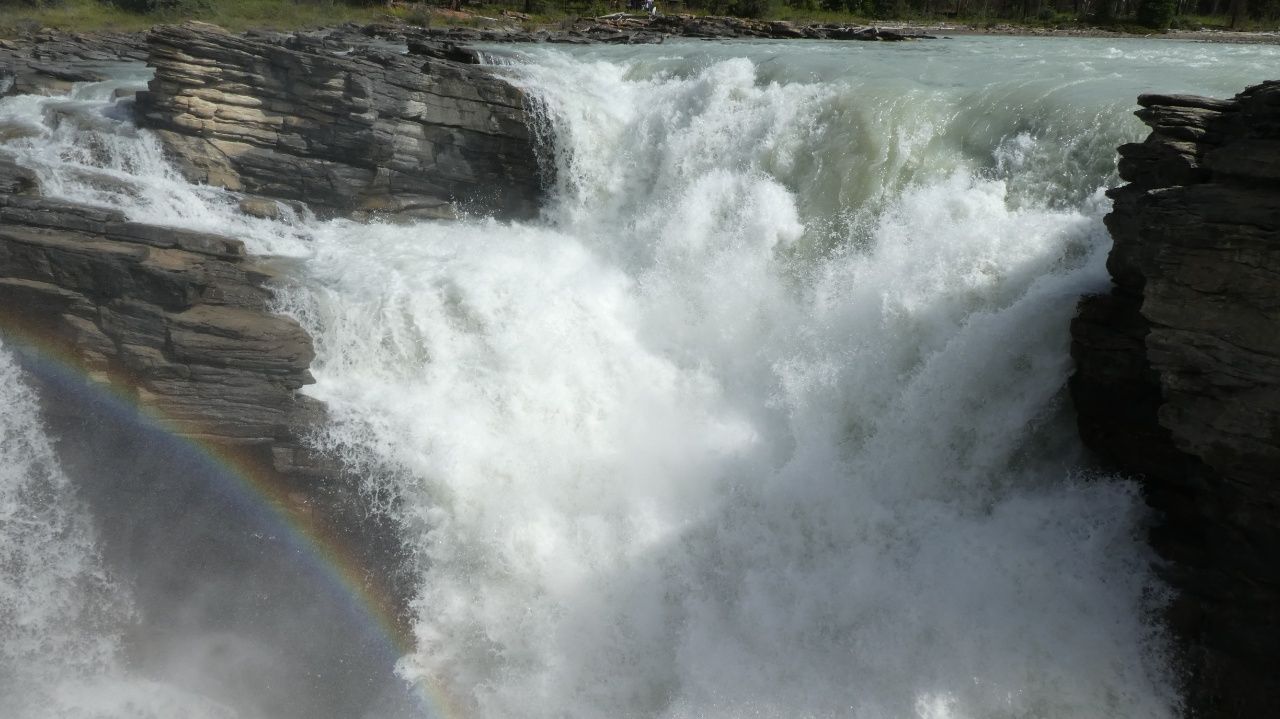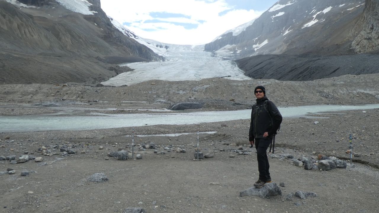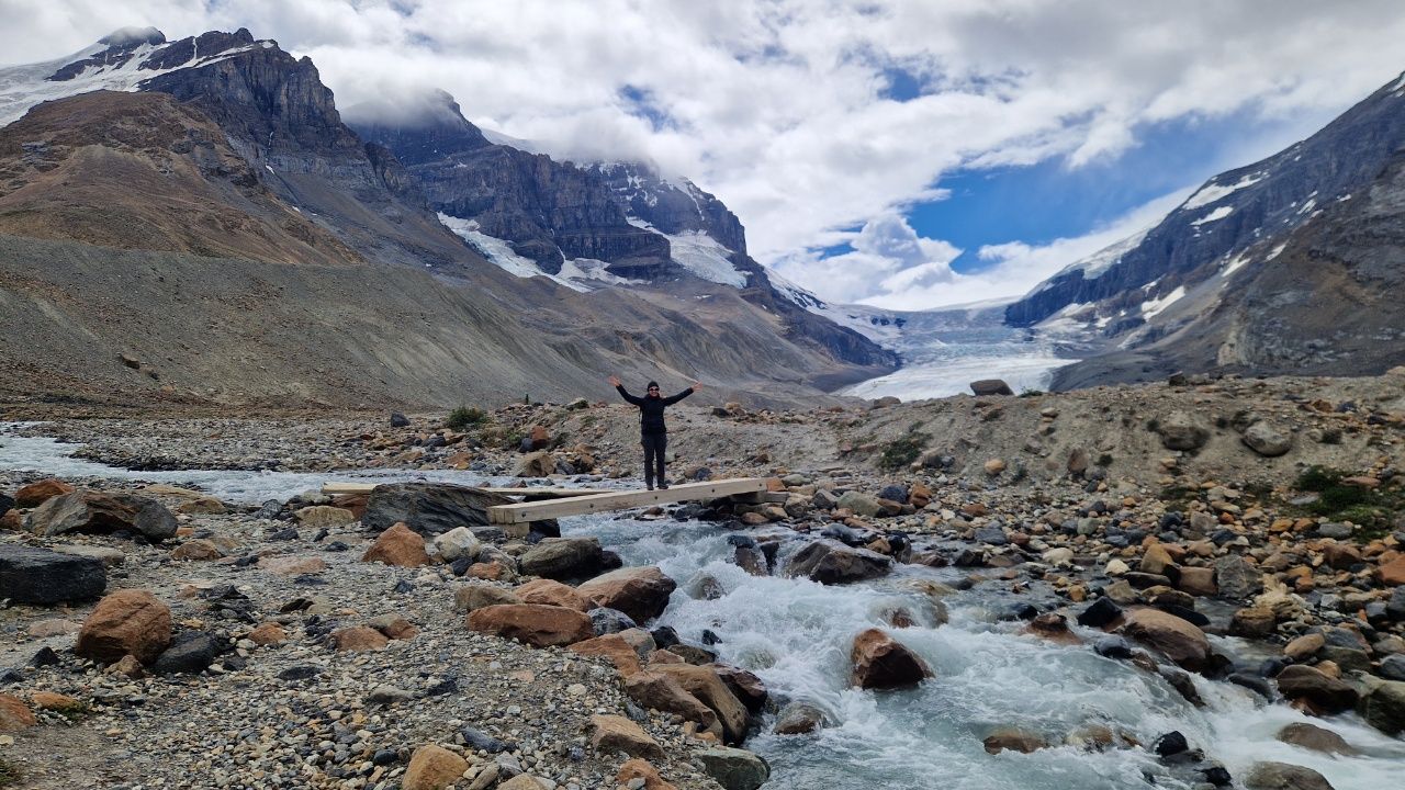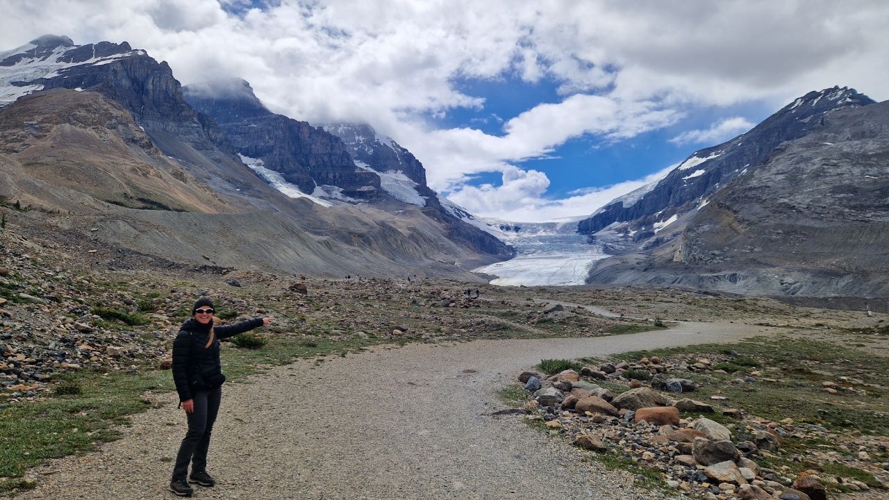 Auf unserem Campingplatz sehen wir früh einen Wapiti.Wenn man aus dem Autofenster schaut, sieht man kilometerweit beindruckende Berge, kristallklare Flüsse & grüne Wälder, bis zum Horizont und soweit das Auge reicht!„Athabasca Waterfalls“ im Jasper NationalparkDie Athabasca Wasserfälle sind nicht wegen ihrer Höhe bekannt, sondern wegen der Kraft mit der das Wasser über den Fall fließt.Auf dem Weg zum zweiten Wasserfall sehen wir einen Schwarzbär am Wegesrand laufen. Der Schwarzbär ist ungefährlicher und kleiner als der Grizzly Bär, trotzdem sind wir froh, dass wir auf unseren vielen Wanderungen noch keinem begegnet sind.„Sunwapta Waterfalls“ Sunwapta bedeutet in indigener Sprache „wildes Wasser“Wir laufen zum Columbia Icefield, das ist ein Eisfeld des Athabasca-Gletschers.Wir laufen ca. 1 Stunde hin und zurück. Es ist recht kühl!Ich stehe auf einem vom Gletscher abgeschliffen Felsen.Näher können wir nicht an den Gletscher heran laufen.Schnell noch ein Selfie und dann geht’s wieder zurück und mit dem Wohnmobil weiter.Der „Peyto Lake“ – Dieser See hat seine blaue Farbe durch feine Gesteinspartikel vom Gletscher, die den roten Anteil des Lichtes absorbieren.Auf unserem Campingplatz in Lake Louise gibt es wie überall bärensichere Mülleimer.