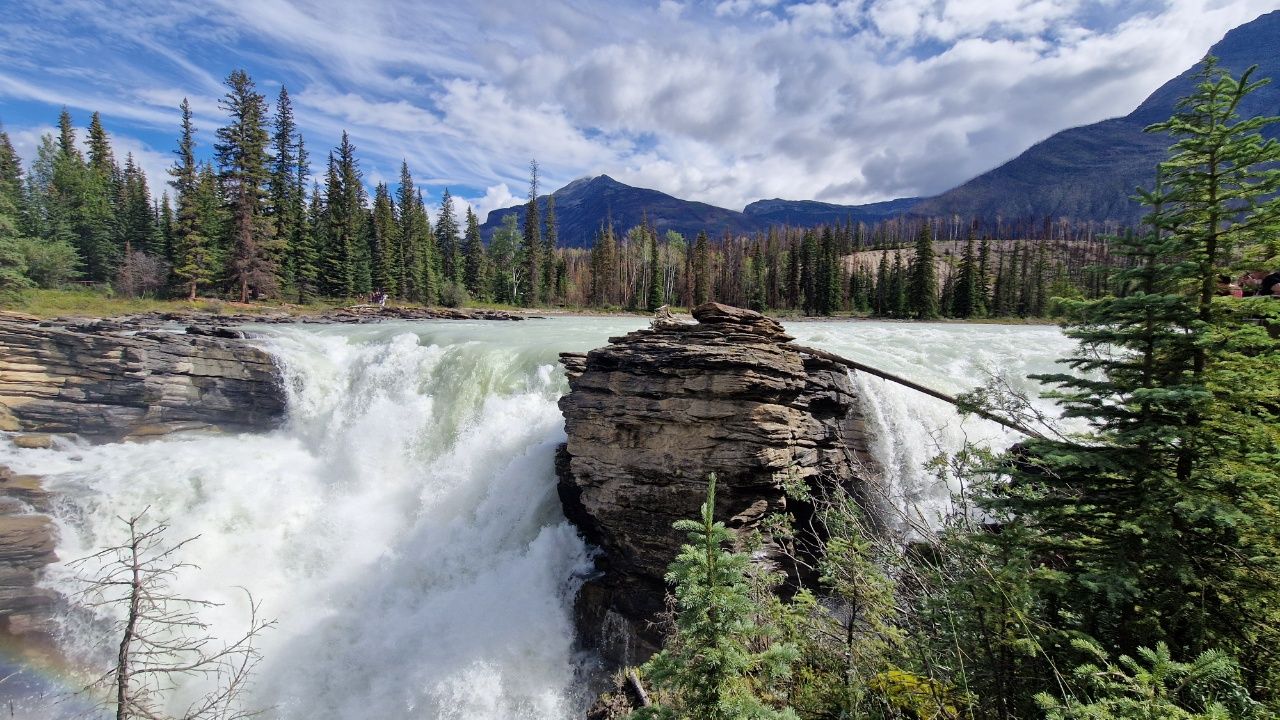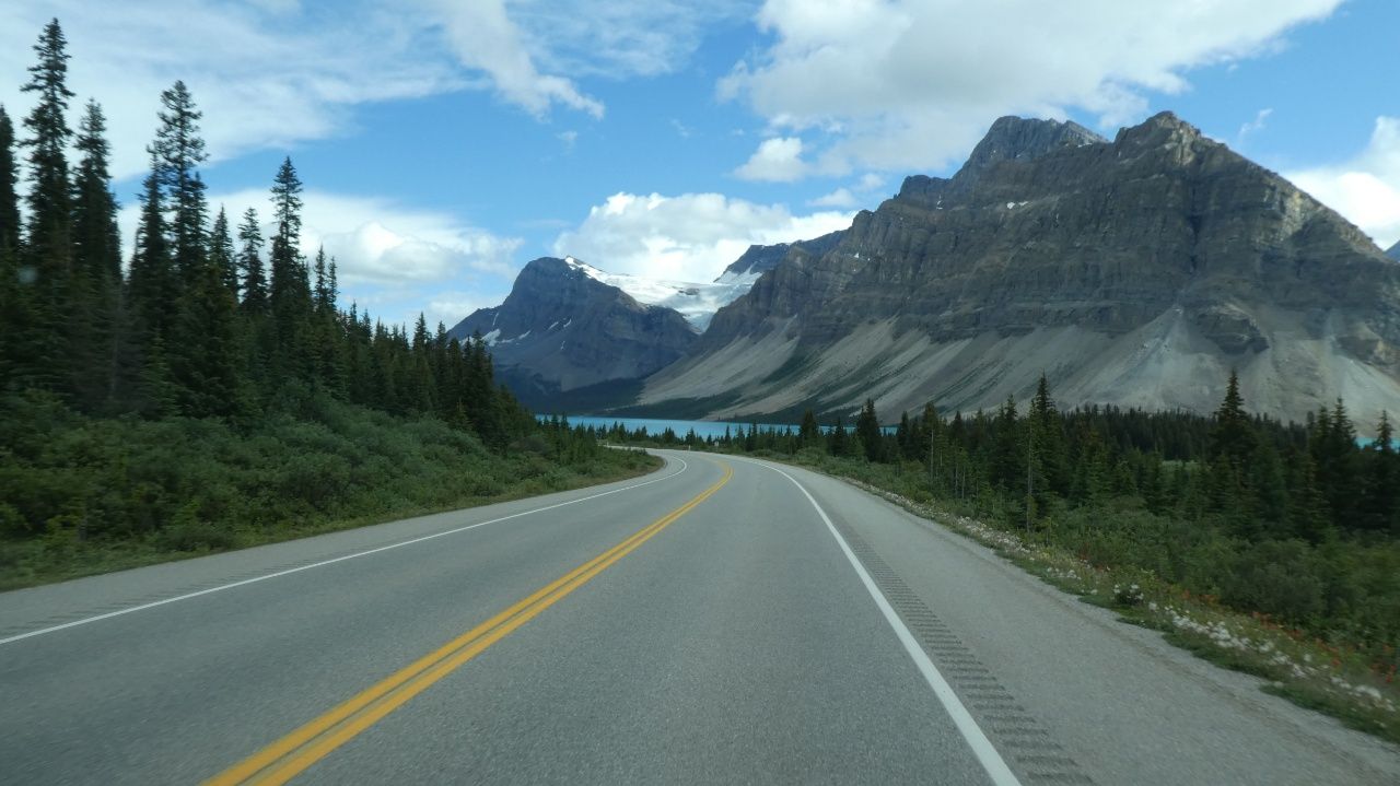 Wir sind ganz platt von dem Tag und schlafen am nächsten Tag länger aus. Am darauffolgenden Tag geht es also erst um 11Uhr los. Wir fahren die berühmte Panoramastraße in den kanadischen Rocky Mountains – den Icefield Parkway (übersetzt als Gletscherstraße) ca. 230km herunter. Auf dem Weg in die Stadt „Lake Louise“, in der wir übernachten werden, schauen wir uns vier Sehenswürdigkeiten an. Zuerst zwei Wasserfälle, danach einen Gletscher und dann einen See.
