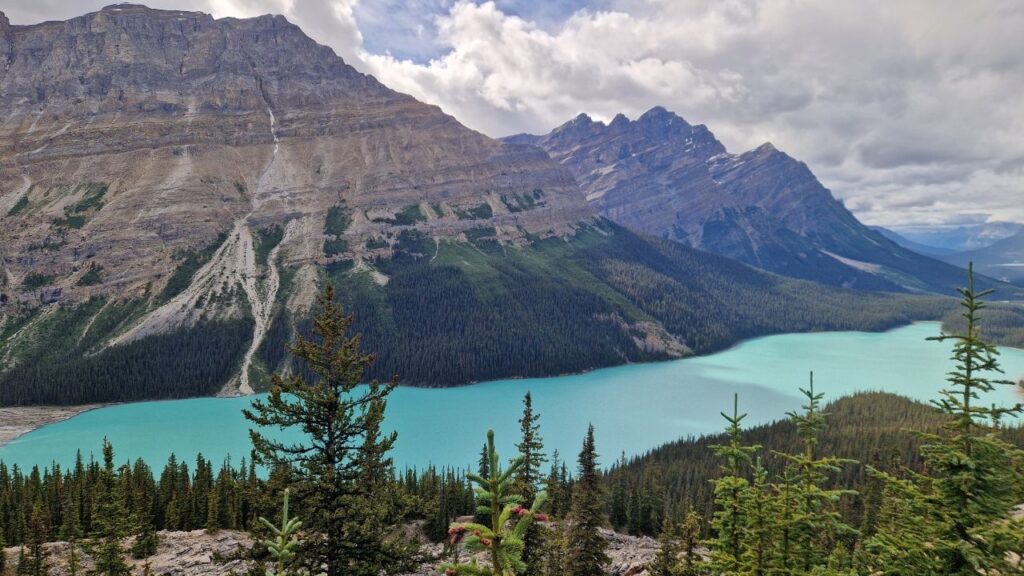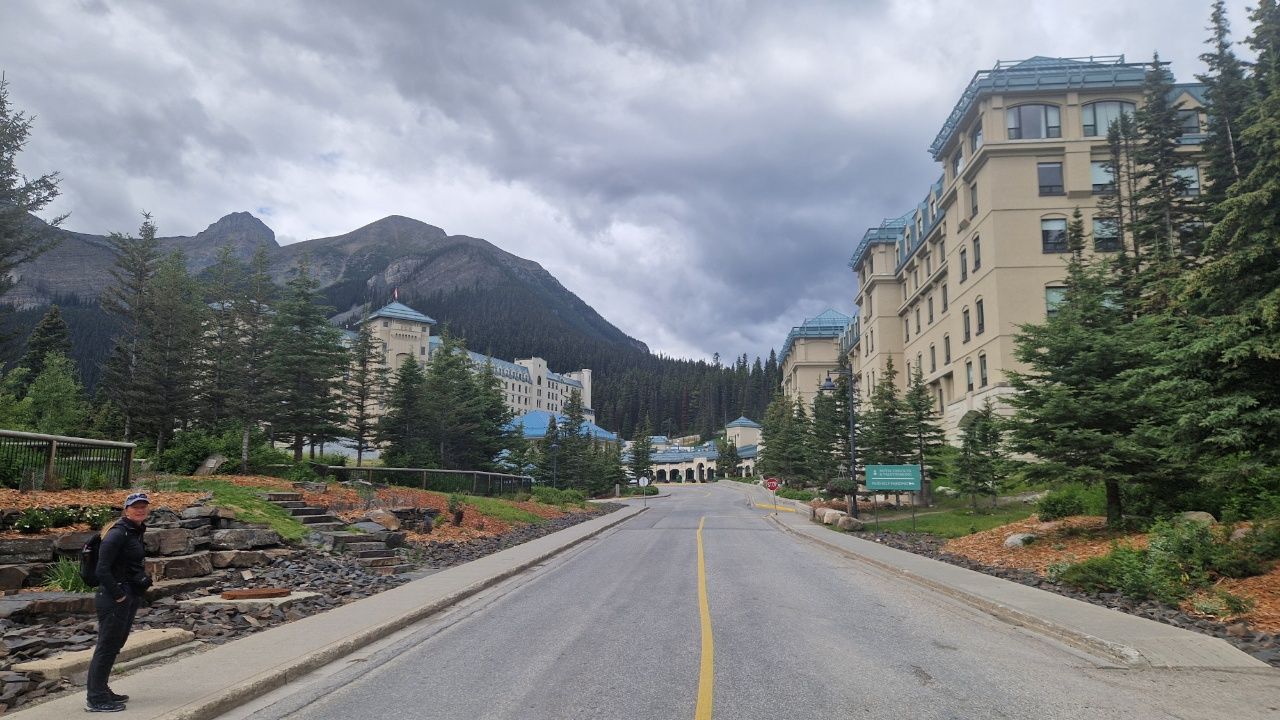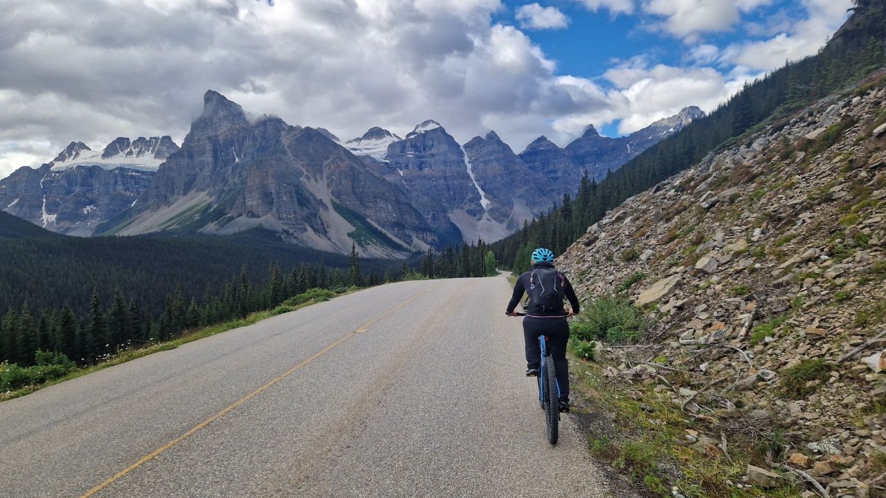 Früh um 9Uhr leihen wir uns Fahrräder für 59 kanadische Dollar (CAD) ausAuf geht’s! Immer schön den Berg hinaufGanz schön anstrengend diese Fahrt! Wir machen nur eine kurze Pause, denn es könnte immer ein Grizzlybär im Wald herum schleichen. Bärenspray haben wir immer dabei.Endlich am „Moraine Lake“ angekommenDer „Moraine Lake“ ist auch ein von Gletscher gespeister Bergsee, daher die türkisblaue Farbe. Übrigens eines der häufigsten fotografierten Motive Kanadas.In den Felsen beim Moraine Lake flitzen kleine „northern Pikas“ umher (übersetzt Pfeifhase). Er ist bekannt für seine lauten, pfeifenden Rufe.Auch kleine Streifenhörnchen flitzen über die Felsen. Sie sind sehr schwer zu fotografieren, weil sie so schnell sind, aber ich habe es dennoch geschafft.Mit dem Mountainbike geht es weiter zu einem weiteren schönen Bergsee, dem „Lake Louise“Wir sind froh hier oben am „Lake Louise“ angekommen zu sein, denn danach geht es mit dem Fahrrad nur noch bergab.Hier am Lake Louise gibt es ein Luxushotel für reiche Touris 🙂