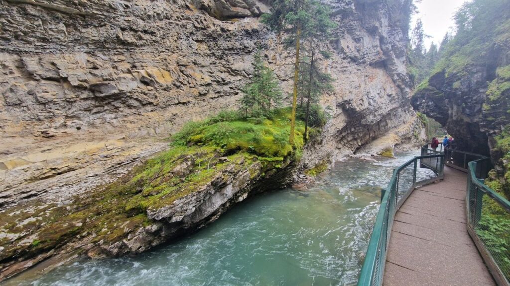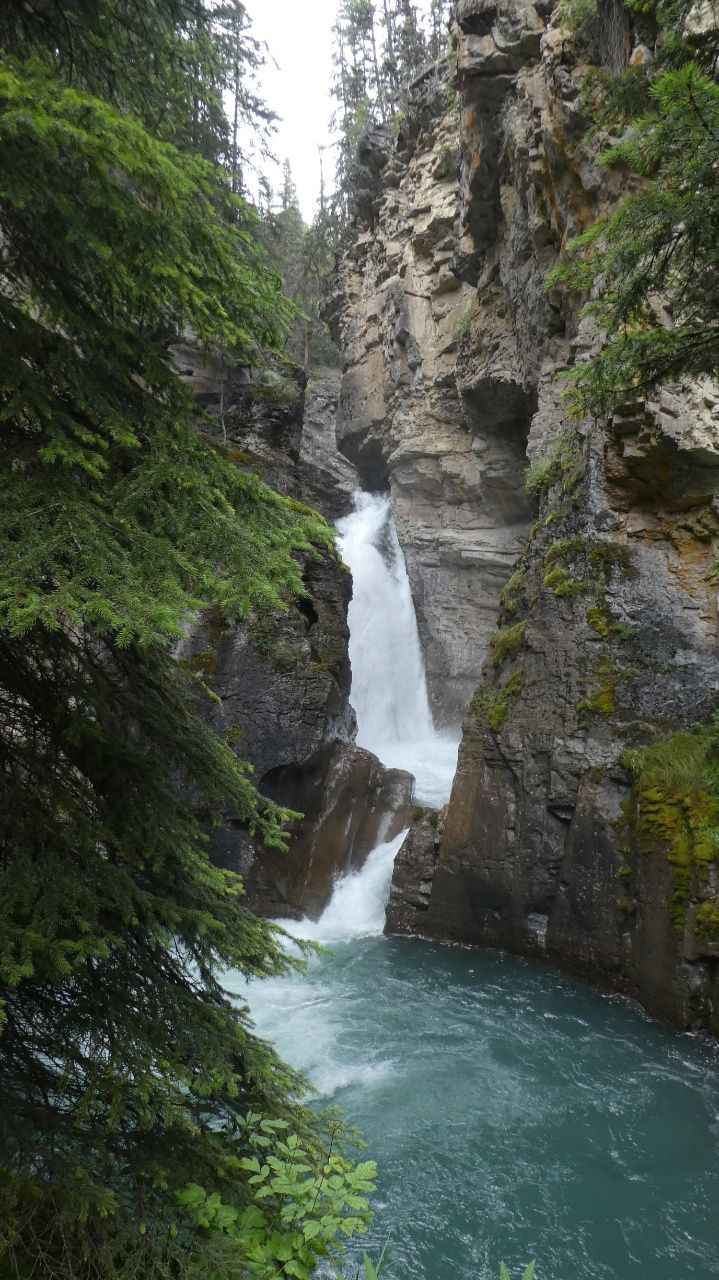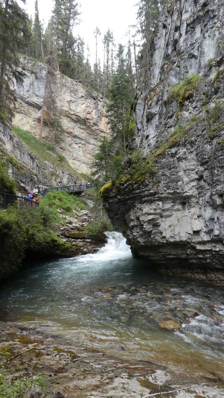 Wir wandern ca. 1,5km im Johnston Canyon zu den „Stella Falls“Der Johnston Creek hat sich in das Kalkgestein hineingeschnitten und diese Schlucht geformt.Die „Stella Falls“ im Johnston Canyon