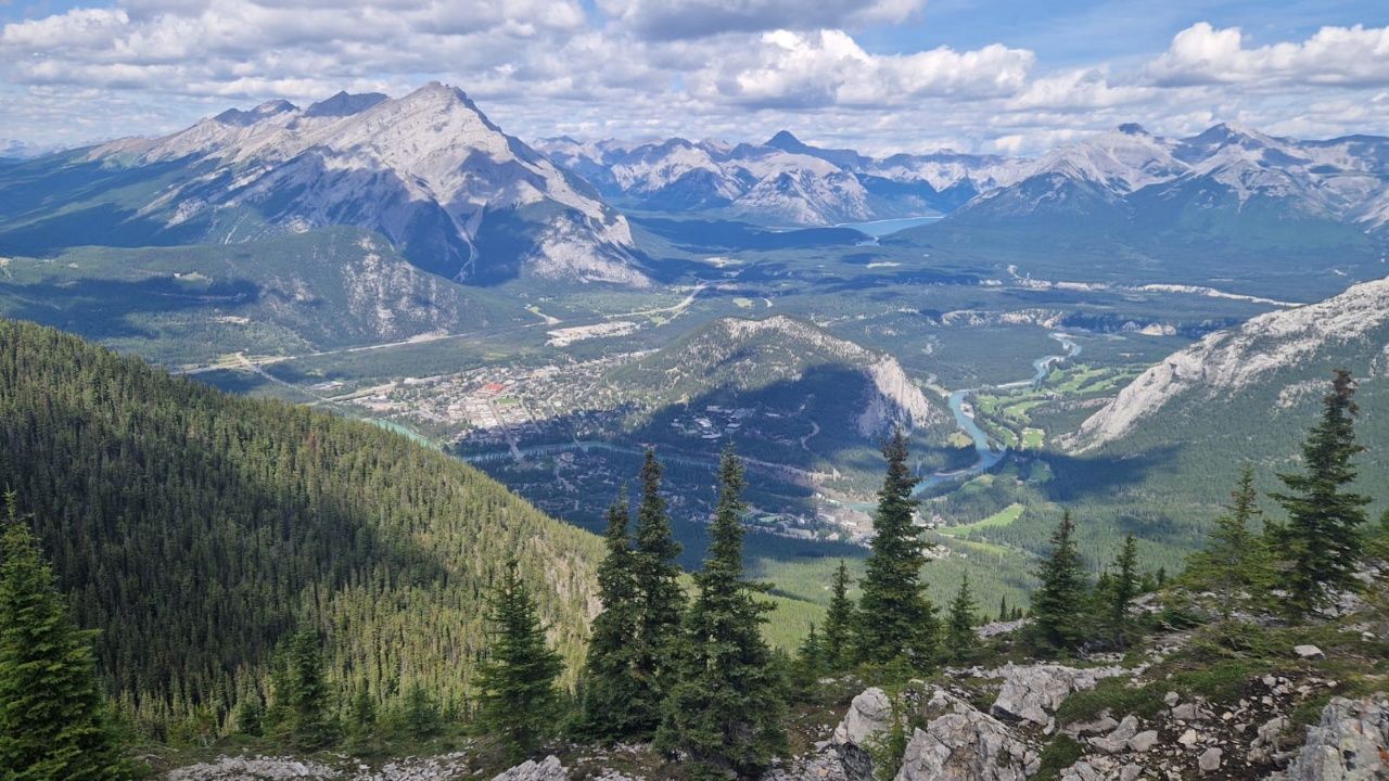 Danach geht es mit Bus und Gondel weiter hoch. Hier haben wir einen wunderschönen Blick vom Gipfel des Sulphur Mountain auf die Stadt Banff.