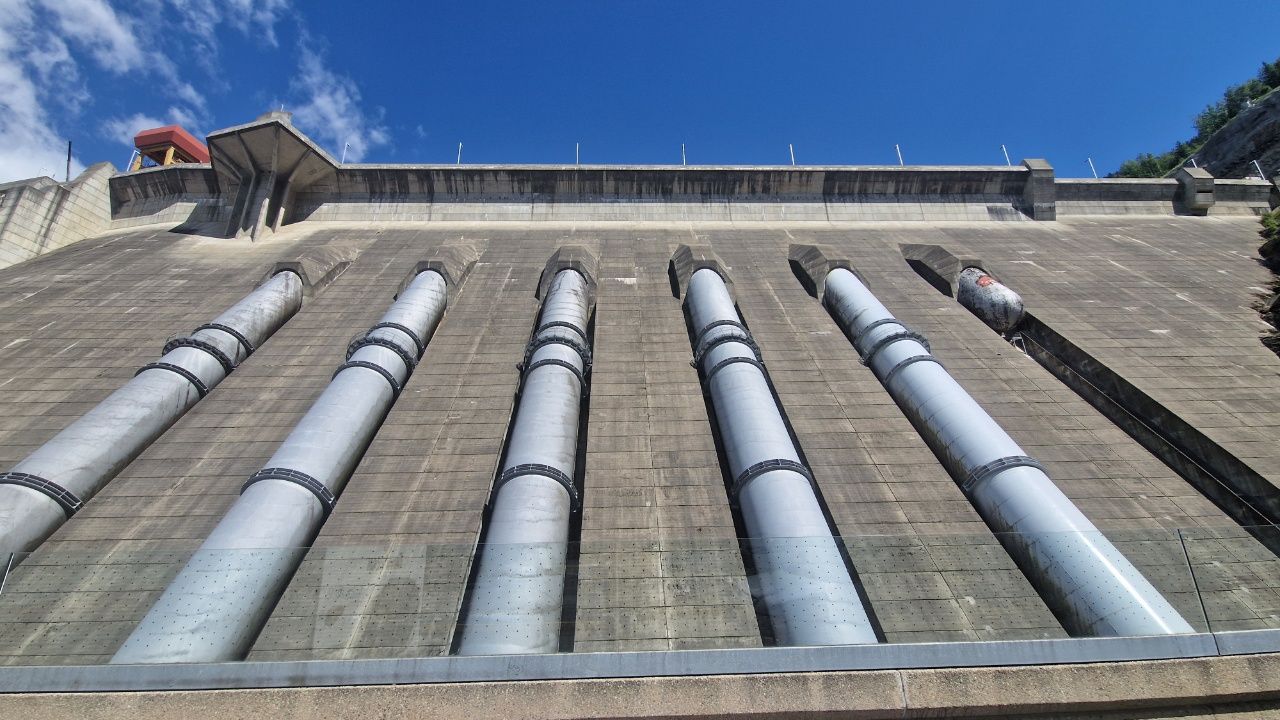 Fünf Druckrohrleitungen (Penstocks), die das gestaute Wasser zu den Turbinen leiten, sind aktiv, die sechste befindet sich noch im Bau.