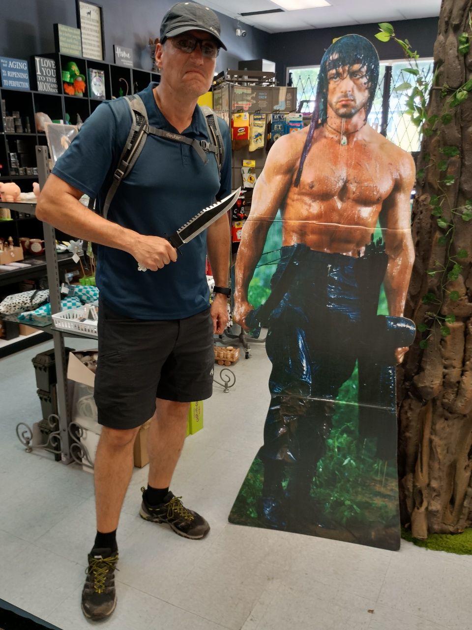 Einige Geschäfte in Hope verkaufen Souvenirs von Rambo. In diesem Laden gab es Rambo-Messer für ca 400 bis 500 CAD. Die Verkäuferin war super nett und hat Marco sogar erlaubt vor dem Rambo-Schild mit einem der Messer zu posieren.