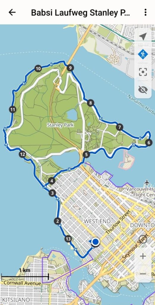 Mein Joggingweg (15,2km)! Auf diesem „Stanley Park Seawall Park“ gibt es einen geteerten Weg immer am Wasser entlang, auf dem nur Fußgänger oder Jogger erlaubt sind, total schön war das!
