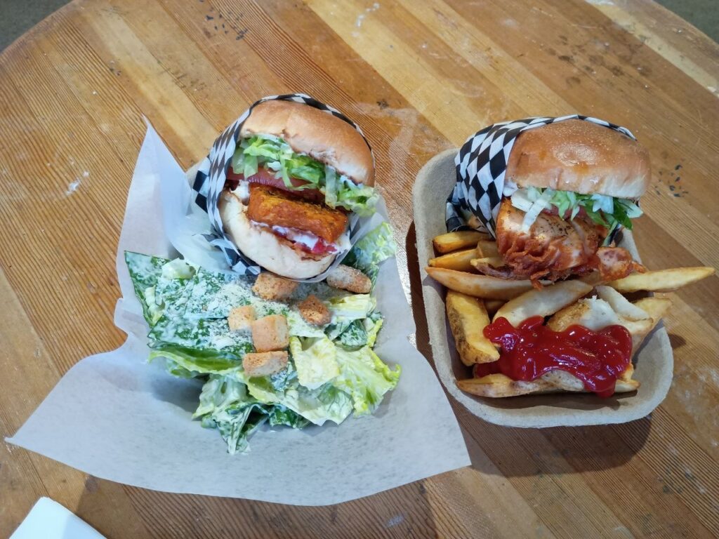 Wir fahren Abends zur „Granville Island Markthalle“, welche wir schon kennen und uns besonders gut gefallen hat. Dort essen wir noch einen Lachs-Burger (rechts Salmon Pacific Burger, links Salmon Cajun Burger)…