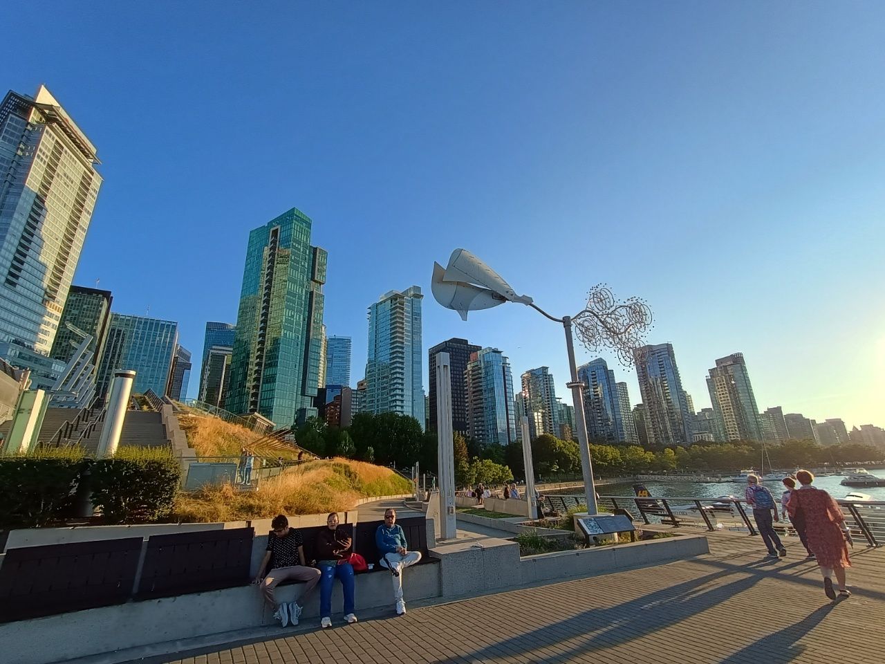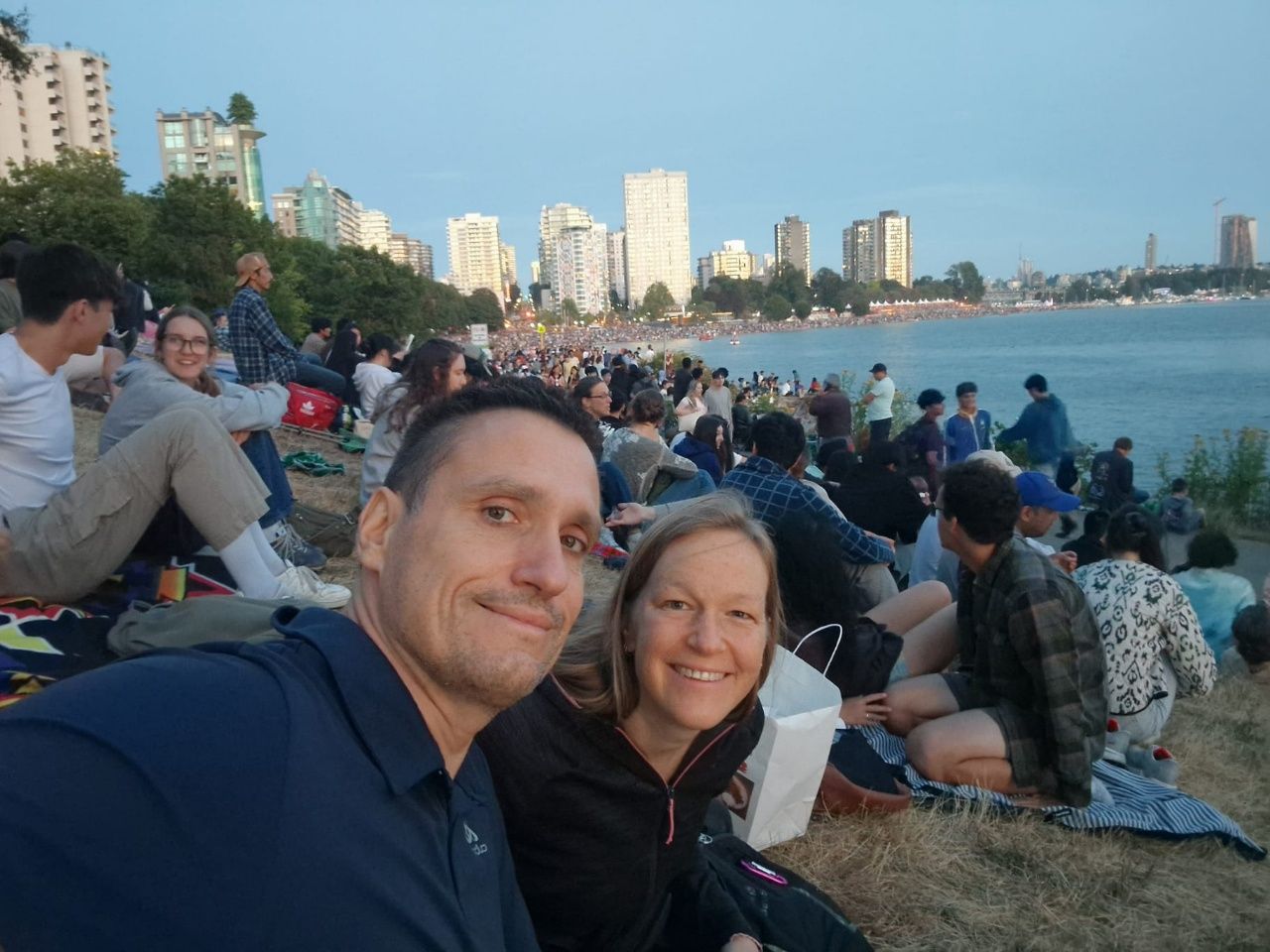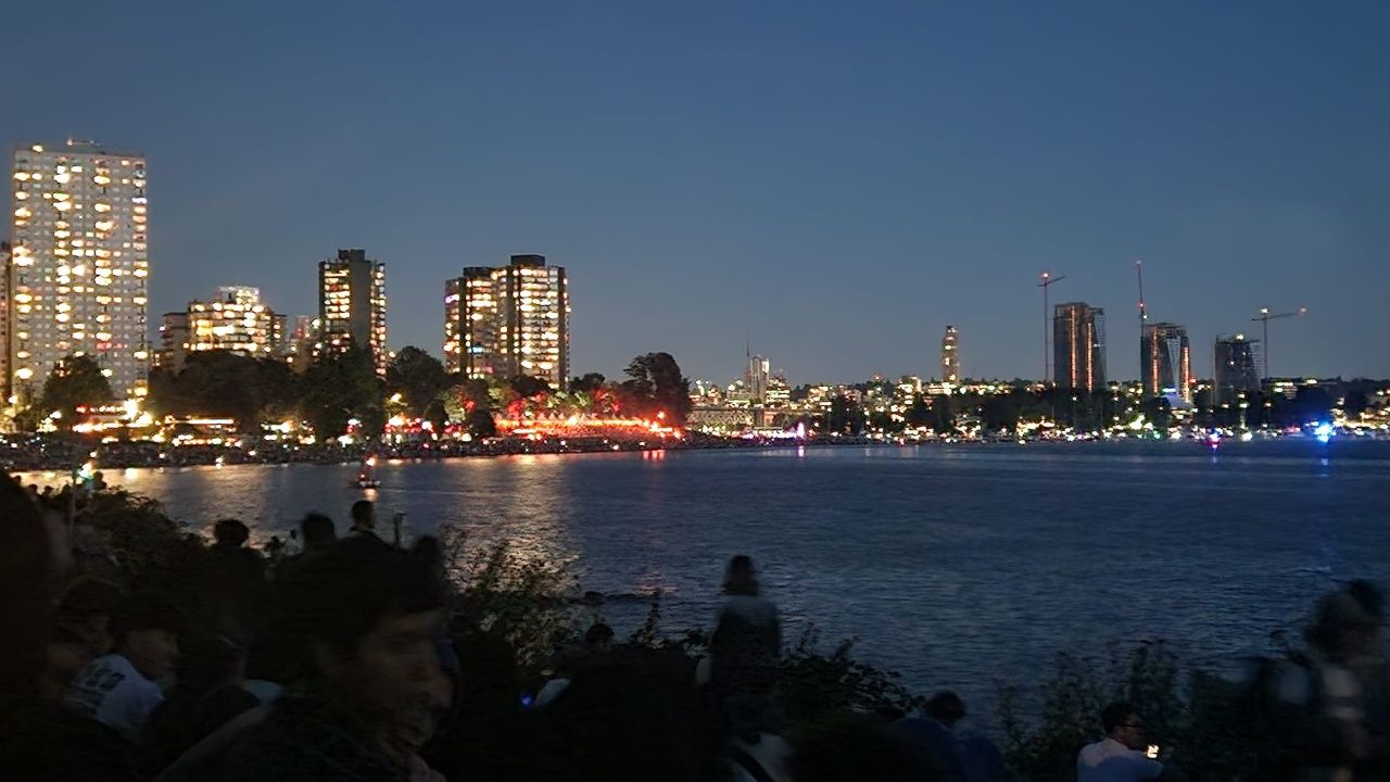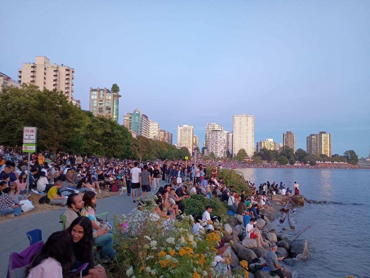 Wir laufen nun zur anderen Seite dieser Burrard-Halbinsel an die Englisch Bay Beach in Richtung Sunset Beach. Hier sammeln sich tausende Menschen, denn hier findet heute das „Honda Celebration of Light“- Festival statt. Halb Vancouver sitzt am Strand und wartet stundenlang mit Campingstühlen darauf, dass eine Drohnenshow und ein Feuerwerk startet.